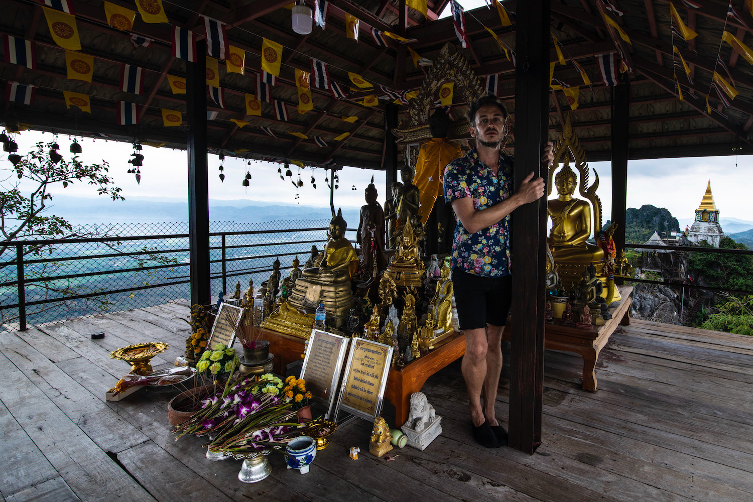 Instead, I wandered into Wat Koh Walukaram, a sprawling and eclectic temple I later learned has no Google reviews. A trio of vocal (but harmless) puppies welcomed me onto the grounds, which were devoid of humans apart from a man reading a book next to the bell tower, from which a laminated sign (in English) hung. “Climb the stairs to take a photo.”