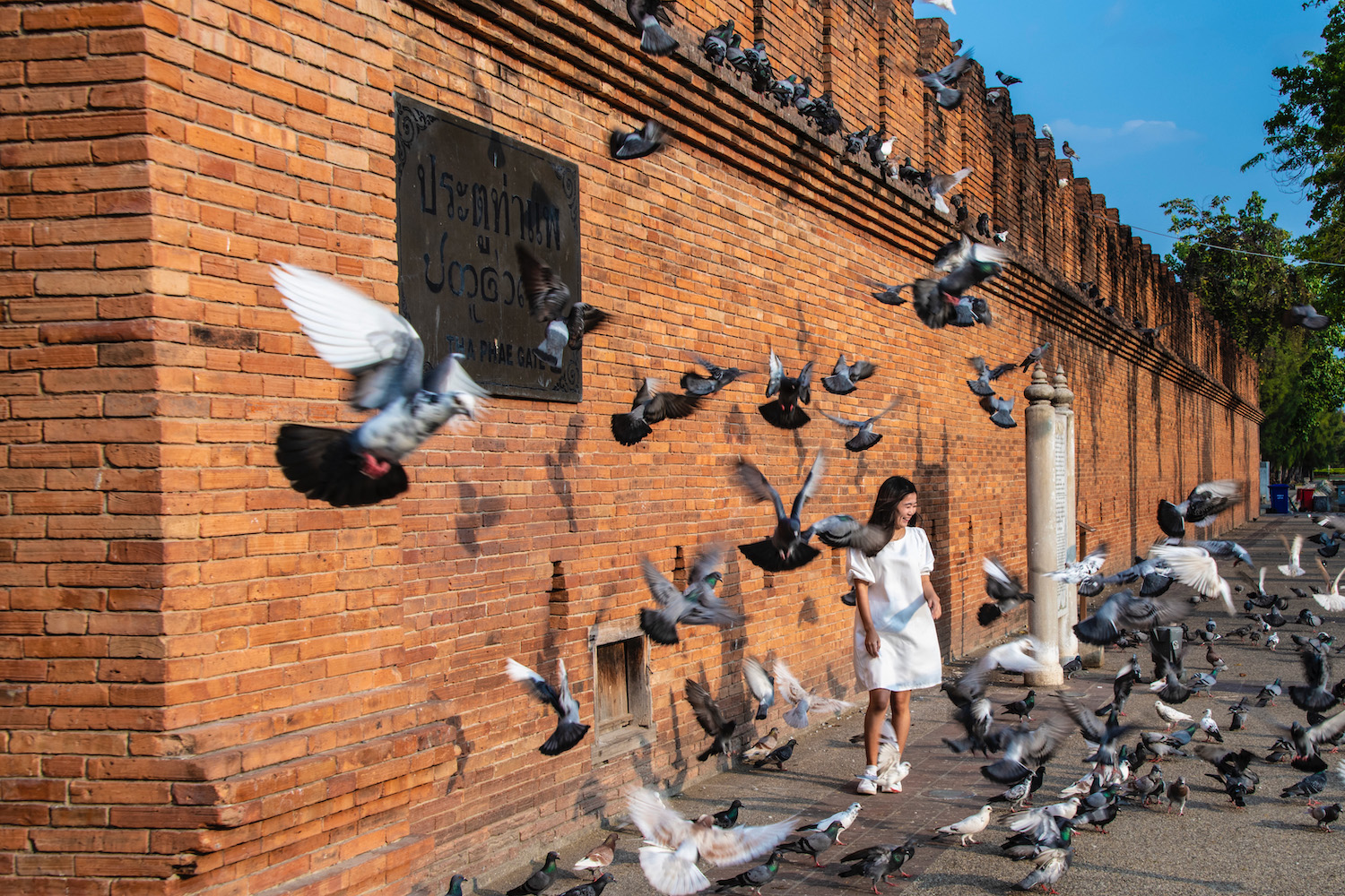 As I walked westward, the clouds seemed to follow me, intensifying the chill and my nervousness in tandem. Arriving at Tha Phae Gate, however, the same good fortune that had followed me onto the grounds of Wat Phra Singh showed itself again: Sun rays pierced the clouds precisely at the moment the gate’s famous pigeons exploded away from the ground.
