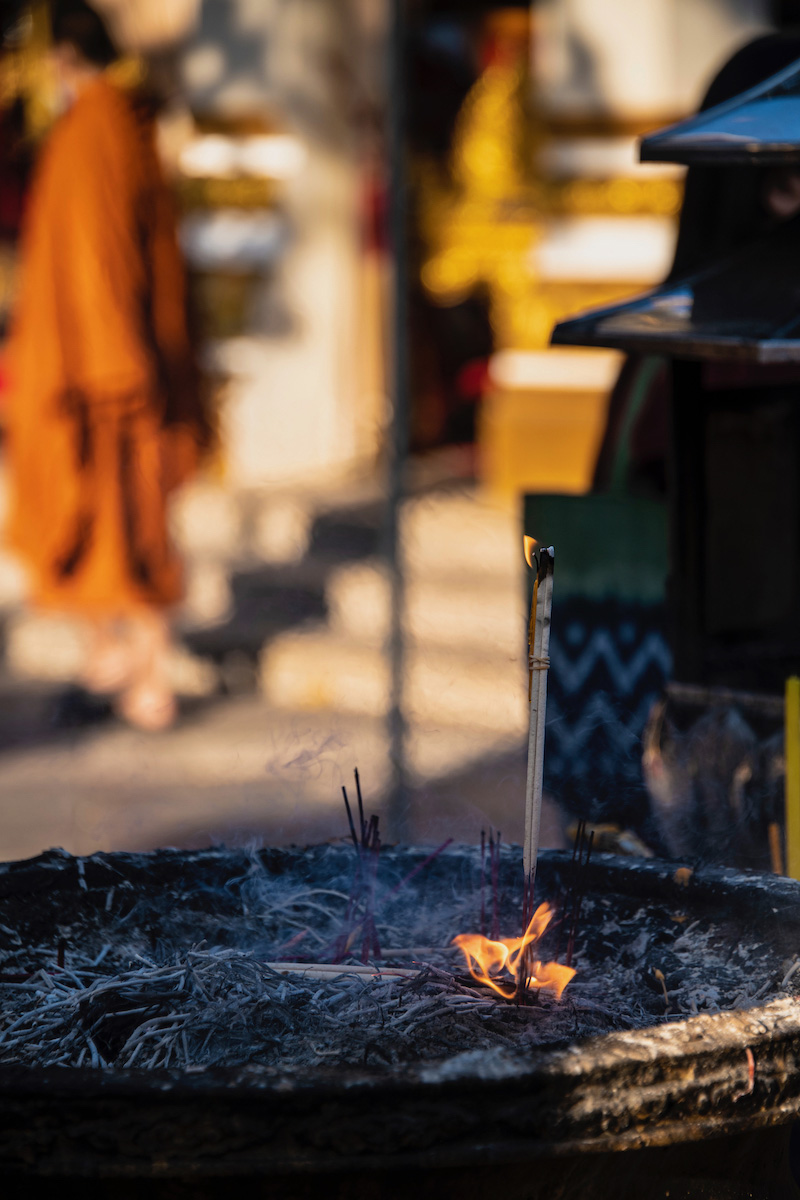 Before summiting the Buddha, Prus suggested we purchase a Naga lantern and offer it, I assumed for a karmic boost to whatever deficiency that had seen us lapse into warring. As we waited to make our donation—I held the lantern, while Prus had just lit a few incense sticks—I watched temple volunteers dispose of earlier donations: The lanterns were carefully placed into blue baskets, while the smoking sticks were swept into green buckets of water.