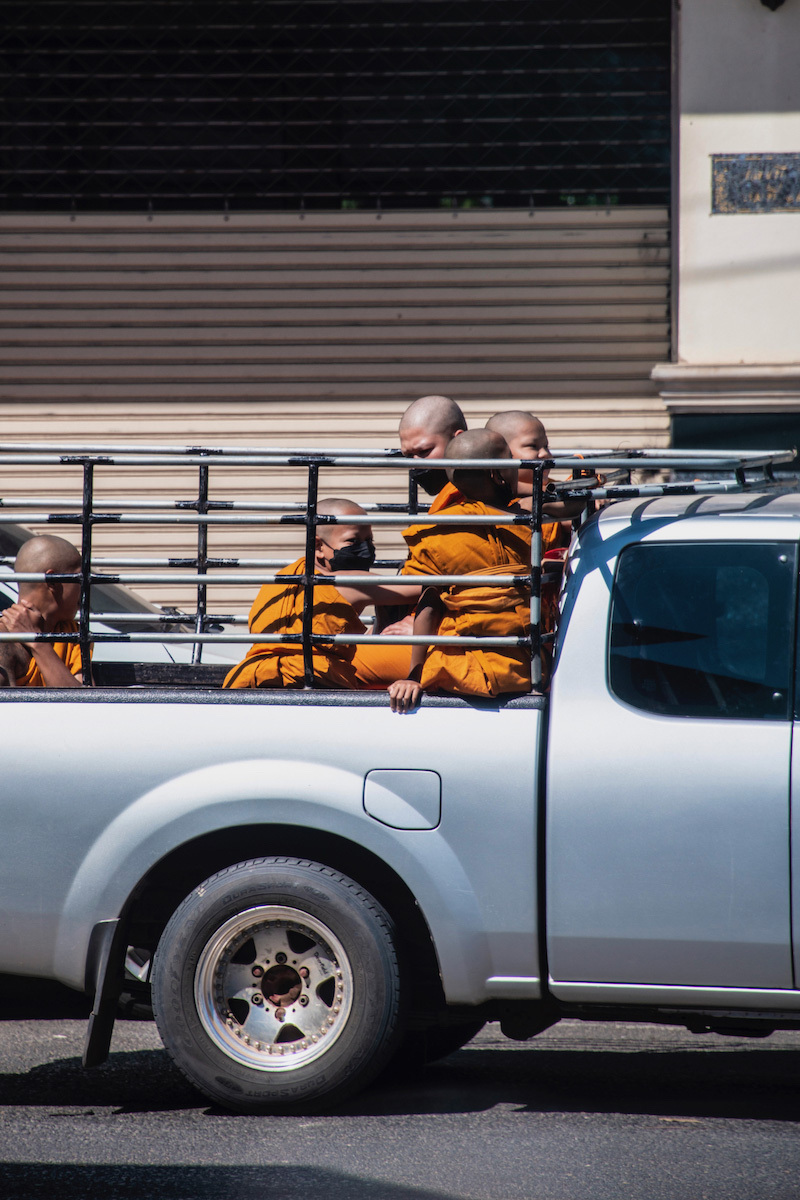 I meditated on what that might’ve meant as we sped out of town and onto the highway toward Mukdahan, particularly when we passed a procession of monks walking down the other side of the road. I’d been karaoke-serenading sleepy Prus again; he made sure to drive me slowly past the parade so I could get a good picture, I guess as a reward for my service.