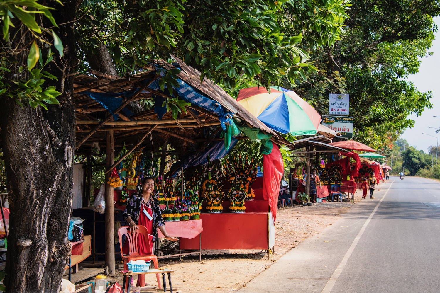 Combined with the fiery blossoms falling off the Flame Trees overhead, and the seeming endlessness of the stalls one after another, their fluid motion gave the entire scene an otherworldly feel, like we had driven into a Thai horror movie. I half-expected an actual ghost to be sitting under one of the yellow sala I saw on either side of the thanon every few hundred meters, but no beings of any sort made use of the shelter they offered.