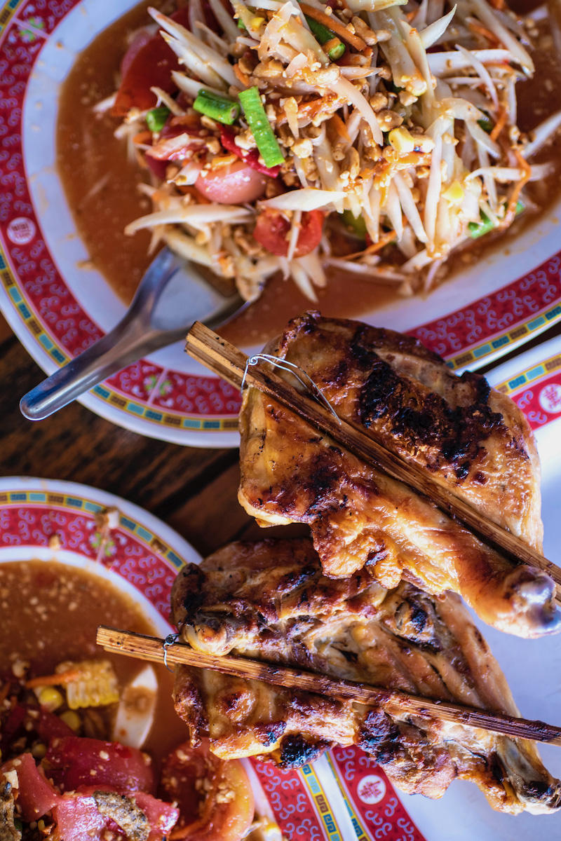 “Have you ever noticed,” I asked Prus, who was taking a bite of sauce-covered gai yang glued to sticky rice, “how pale and pink the tomatoes in som tam are?” Their color matched their flavor, which complimented the rest of the papaya salad like it had been made in a supercomputer, instead of a mortar and pestle.