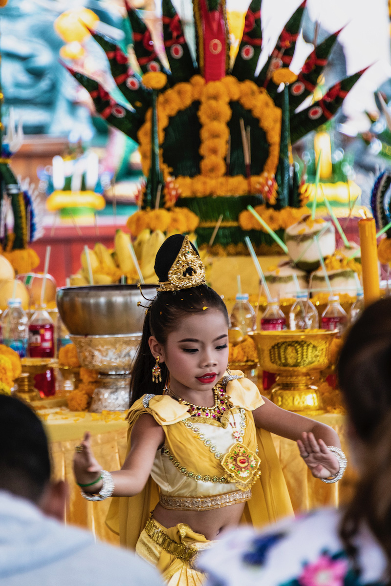 On the way out, after Prus gave his offering, I noticed a child dancer (she couldn’t have been older than six or seven) performing in full makeup under a tent where no less than two dozen Naga images menacingly stood. She knelt down to pick up a scattering of marigold petals from beneath her feet, tossed them up into the air and resumed her routine, without missing a beat.